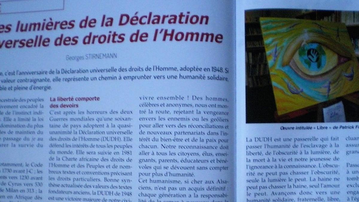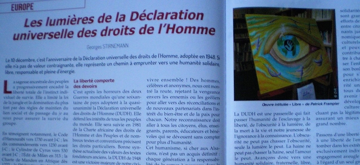 La photo de la peinture "Libre" encadrée par un texte pour les 70 ans de la Déclaration universelle des droit de l'homme, en Décembre 2018. Celui ci a été écrit par Georges STIRNEMANN .